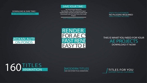 160 Titles 4K Mega Pack 68702509 - After Effects Templates After Effects CS5.5 CS6 and above | FULL HD and HD 1920X1080 and 1280x720 | NO PLUGINS NEEDED | VERY EASY TO USE | 77.14 MB